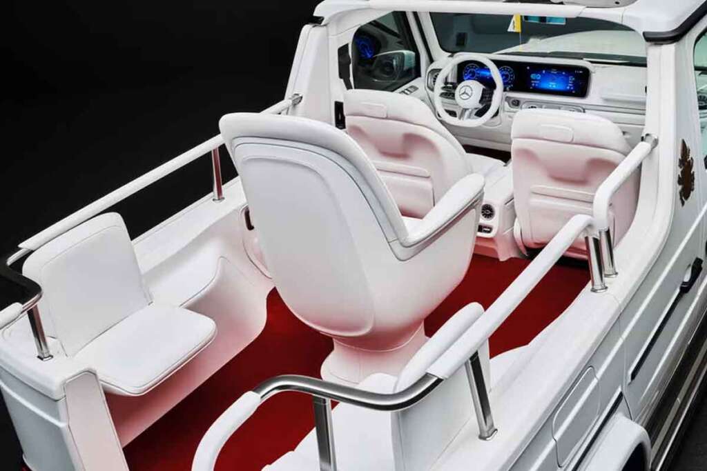 A simple vista, sigue siendo el mismo G-Class de siempre: cuadrado, robusto y con esa actitud de tanqueta urbana. Tiene la cabina transparente arriba para que la gente vea al Papa y reciba la bendición, pero si mirás con atención, hay detalles nuevos: